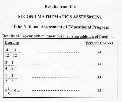 | Project the following NAEP and discuss. In particular, discuss the low performance by students in computing 1/2 + 1/3. Note that this question has been on most NAEP tests with fairly consistent results, and about half of the students who answer this question incorrectly write the sum as 2/5. | ||||||||||||||||||||