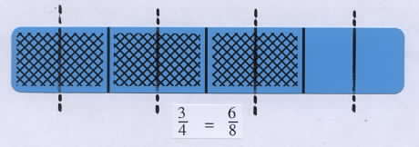 | Another way to illustrate equality of fractions is to split the parts of the bar. Begin with a 3/4 bar and write the fraction 3/4 below the bar. Then by drawing on the bar with a water-base pen, split each of the four parts in half and write the new fraction for the bar. The bar will then have 8 equal parts and 6 of them will be shaded. This activity shows that 3/4 is equal to 6/8. |