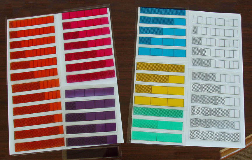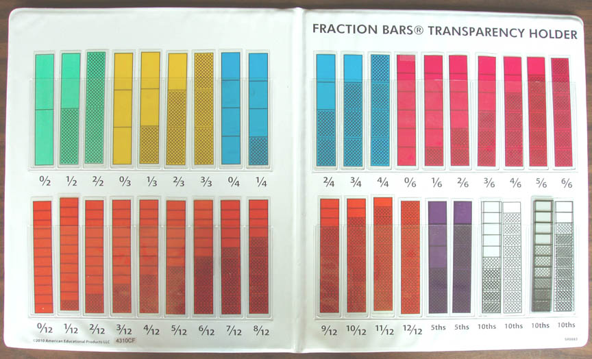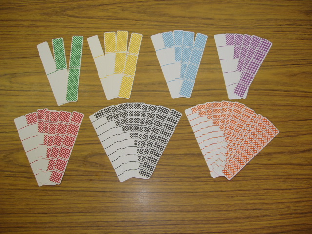 Each of the 49 Fraction Bars Playing Cards is color-coded to correspond to a Fraction Bar and contains a fraction and its name. The colored numeral on the playing card indicates the number of shaded parts and the total number of parts in the corresponding bar and provides for a gradual transition from the Fraction Bars model to the use of fraction symbols. As with the decks of bars, it helps to letter the back of the cards for sorting purposes, one deck with letter A, another with B, etc.